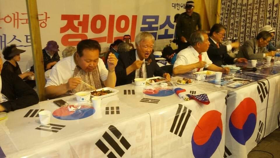 당명이 대한애국당이고, 태극기 사랑을 부르짖는 당에서 태극기 위에 음식을 놓고 식탁으로 쓴다고?