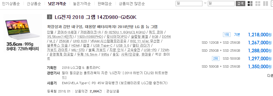 요즘 나오는 그램 14인치는 제일 싼 게 122만원(i5, 8기가 메모리, 스스디는 256)