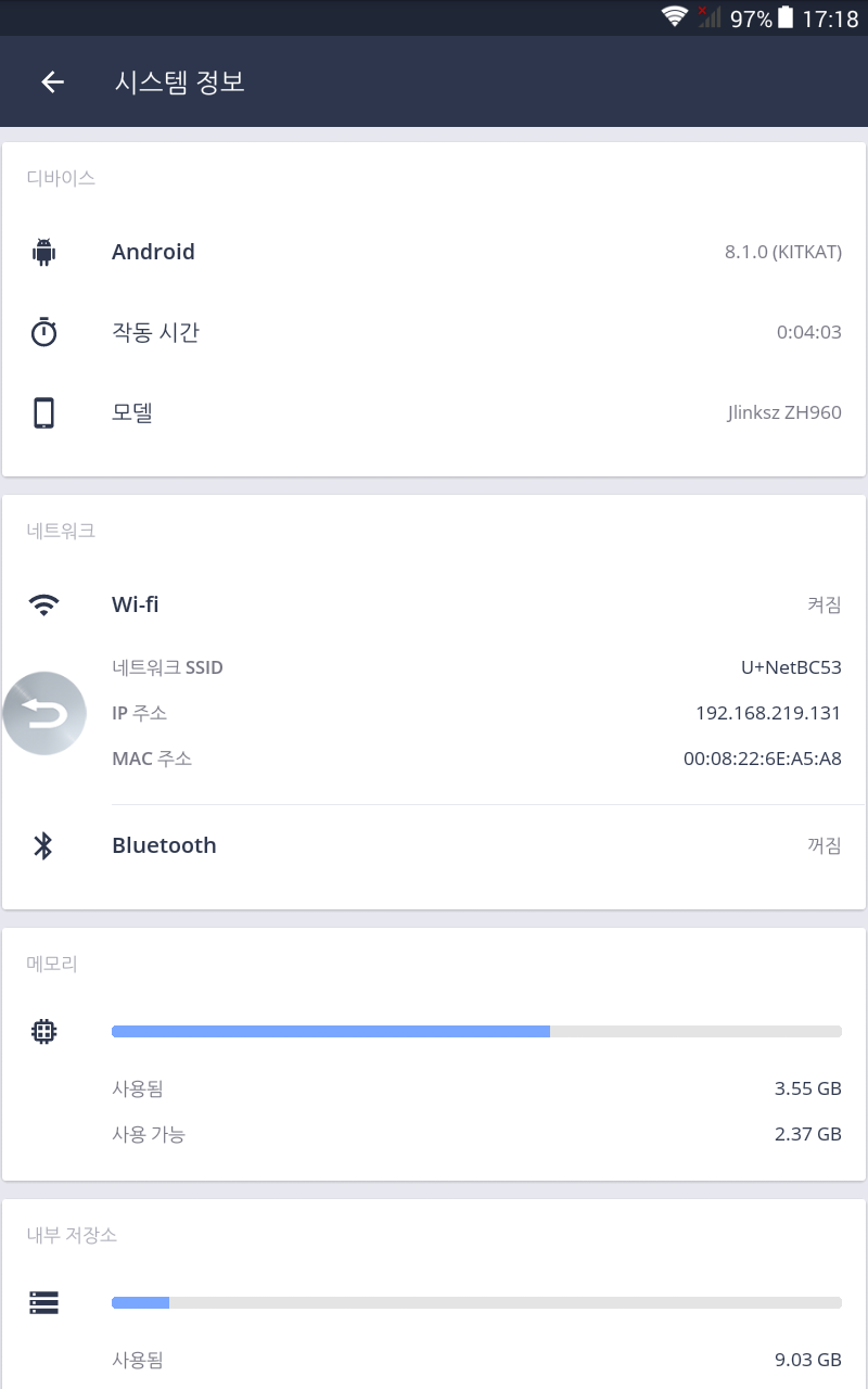 이 태블릿도 실제 안드로이드 버전은 4.4(kitkat)인 걸로 보이는데 표시 버전은 8.1.0이다.