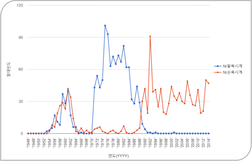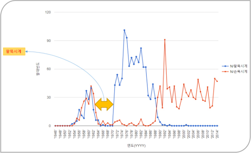 <그림 2>에서 보듯이 1960년대 중반부터 1970년까지는 이상하게도 ‘손목시계’와 ‘팔목시계’의 빈도가 바닥을 치고 있다. 이 시기는 ‘팔뚝시계’가 빈자리를 채우고 있다(팔뚝시계가 1960년대에 등장했을 것임은 놀랍게도 전산학을 전공하는 고려대학교 이도길 교수가 알려 주었다).