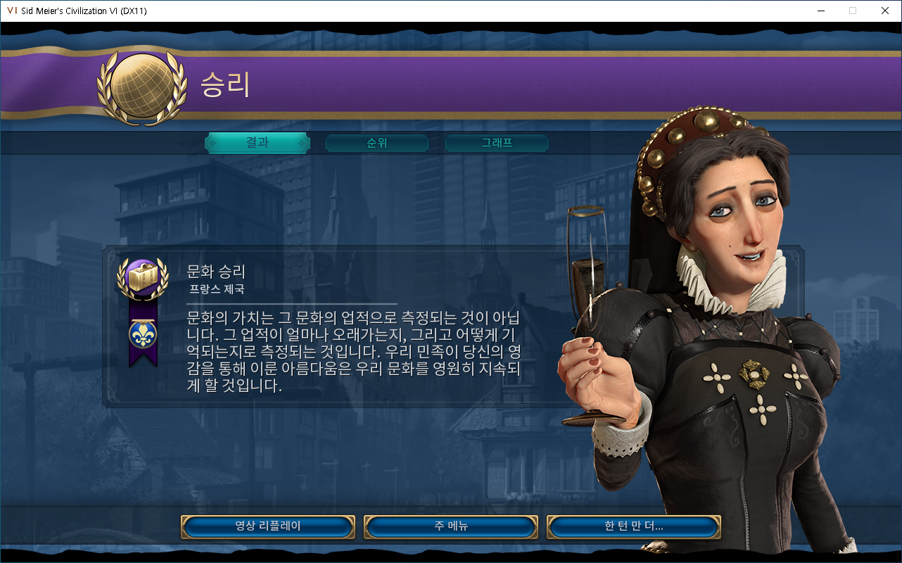 순위 확인은 안 했지만, 1~2등은 유지할 거라고 생각하면서 열심히 하고 있었는데, 2010년 전후한 어느 시점에(정확히 기억이 안난다.) 갑자기 "승리"라고 나오면서 문화 승리를 해 버렸다.