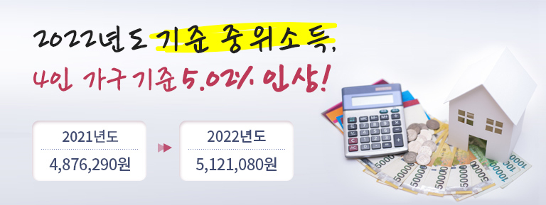 2022년도 기준 중위소득은 4인 가구 기준으로 올해 487만 6290원 대비 5.02% 인상된 512만 1080원으로 결정되었다.