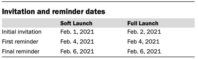 2월 1일과 2월 2일에 소프트 런칭과 전체 런칭이라는 두 가지 개별 출시로 초대장이 발송되었습니다. 60명의 패널리스트가 2021년 2월 1일에 보낸 초기 초대장으로 시작된 소프트 런칭에 포함되었습니다. 초기 소프트 런칭을 위해 선택된 ATP 패널리스트는 초대를 받은 후 하루 이내에 이전 ATP 설문조사를 완료한 알려진 응답자였습니다. 나머지 영어 및 스페인어를 구사하는 패널리스트는 모두 정식 출시에 포함되었으며 2021년 2월 2일에 초대장이 발송되었습니다.