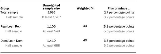 요청 시 다른 하위 그룹에 대한 샘플 크기 및 샘플링 오류를 사용할 수 있습니다. 샘플링 오류 외에도 설문 조사를 수행하는 데 있어 질문 문구와 실제적인 어려움으로 인해 여론 조사 결과에 오류나 편향이 발생할 수 있음을 명심해야 합니다.