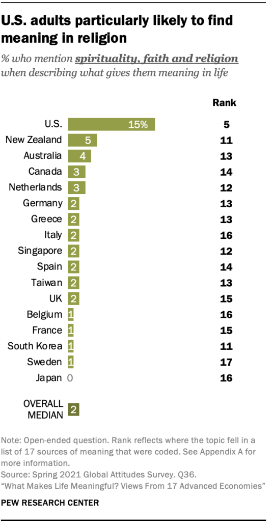 신앙, 종교, 영성에 관한 주제는 일부 사회에서 두드러지게 다른 주제이기도 합니다. 미국 이외의 지역에서 종교는 인용된 의미의 상위 10개 출처 중 하나가 아니며, 미국인이 아닌 일반 대중의 5%도 이를 언급하지 않습니다. 그러나 미국에서는 15%가 종교나 신을 의미의 원천으로 언급하여 다섯 번째로 많이 언급되는 주제입니다. 어떤 사람들에게는 종교에 대한 강조가 예수님과의 개인적인 관계에 관한 것입니다. 나는 내 삶에 도움이 되는 어떤 인간에게도 의존하지 않습니다.” 다른 사람들은 힘든 시기에 동지애와 같은 조직화된 종교의 일부가 되는 이점에 주목합니다. 가족과 친구, 교회, 동료들의 지원이 의미를 찾는 데 도움이 되었습니다. 우리가 나눈 좋은 것들에 대해 생각하는 것뿐만 아니라." 미국의 복음주의 개신교인들은 주류 개신교인보다 믿음을 의미의 원천으로 언급할 가능성이 훨씬 더 높습니다(각각 34% 대 13%). 미국의 모든 종교 단체에서 종교 예배에 더 자주 참석하는 사람들은 덜 자주 참석하는 사람들보다 종교를 언급할 가능성이 훨씬 더 높습니다.