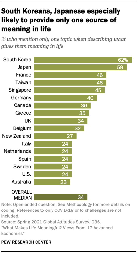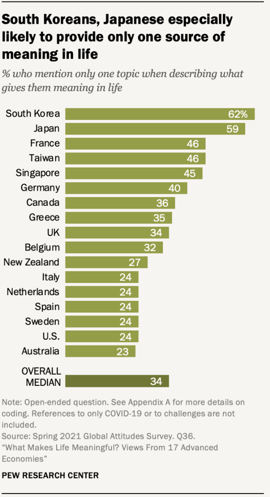 일부 대중에서는 사람들이 다른 곳에서 설문 조사한 사람들보다 응답에서 삶을 의미 있게 만드는 것들을 덜 언급하는 경향이 있었습니다. 예를 들어, 설문에 응한 17명의 대중에서 중앙값 34%가 연구자가 코딩한 주제(예: 가족) 중 하나만 언급함으로써 삶에서 의미를 부여하는 것에 대한 질문에 응답했습니다. 한국과 일본의 점유율은 훨씬 더 높으며, 응답을 제공할 때 적어도 절반이 하나의 의미 출처만 제시합니다.