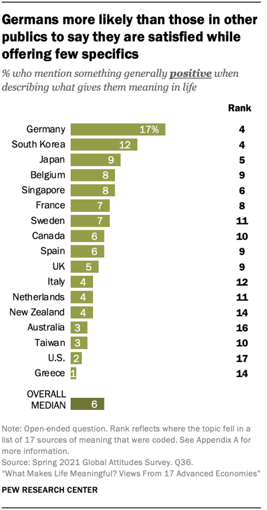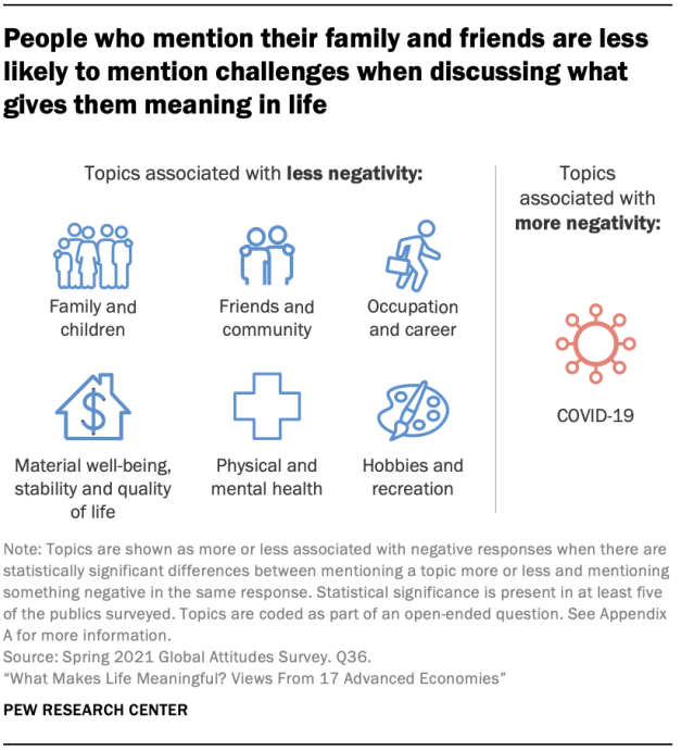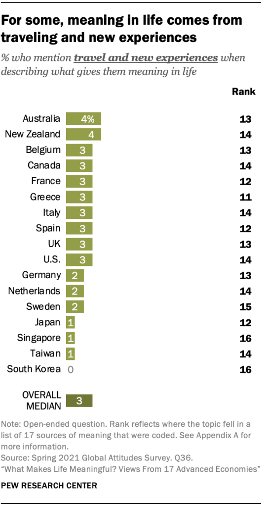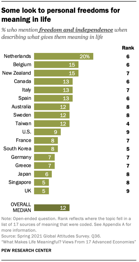 이것은 2021년 2월 1일부터 5월 26일까지 17개 선진국의 성인 18,850명을 대상으로 퓨 리서치 센터에서 실시한 설문 조사의 일부로 삶의 의미에 대한 개방형 질문에 대한 새로운 분석 결과 중 하나입니다.