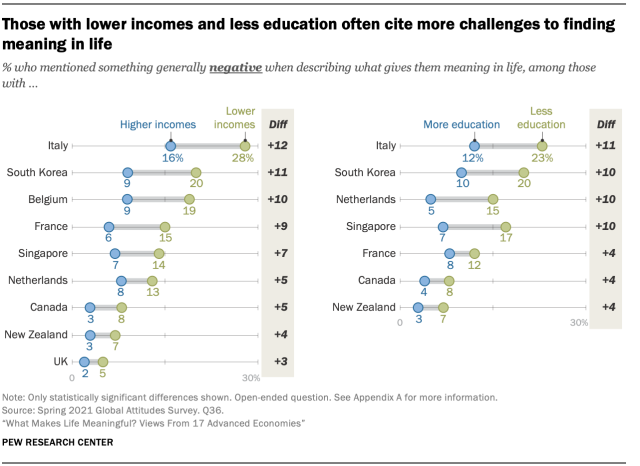 - 교육 수준이 높고 소득 이 높은 사람들은 교육 수준이 낮거나 소득이 낮은 사람들보다 각각 가족과 경력을 의미 있는 것으로 언급하는 경향이 있습니다. 1 , 2 서비스 및 시민 참여에 대한 언급은 교육 수준이 높을수록 높은 경향이 있습니다. 또한 소득이 낮은 사람들은 소득이 높은 사람들보다 삶에 의미를 부여하는 것이 무엇인지 논의할 때 삶의 도전을 언급할 가능성이 다소 높습니다.