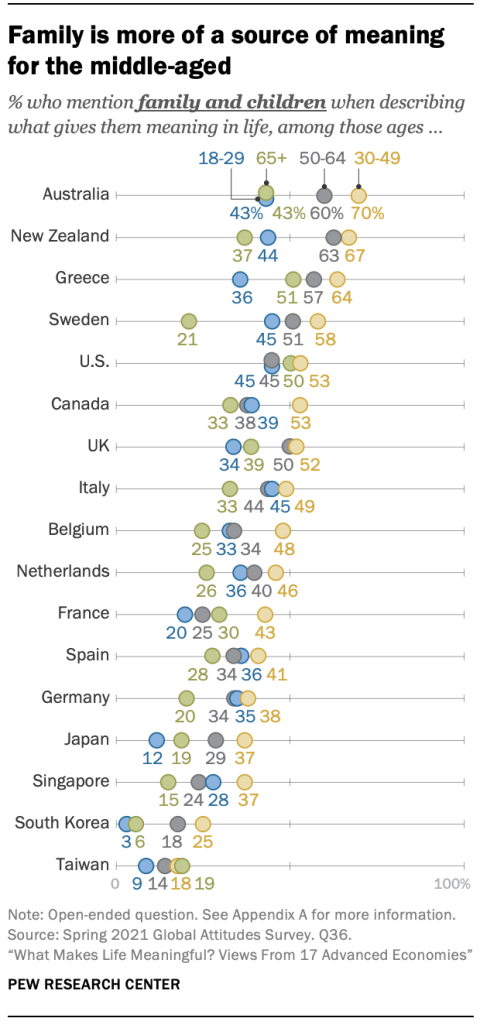 한국, 스페인, 대만을 제외하면 대부분의 대중에게 가족이 가장 중요한 의미를 갖는 반면, 설문에 응한 대부분의 지역에서 30~49세 연령대에서는 특히 자녀를 낳을 가능성이 높은 연령대가 훨씬 더 중요합니다 . 집 . 예를 들어, 호주에서는 30~49세의 70%가 가족을 의미의 원천으로 언급한 반면, 50~64세의 60%는 30세 미만 또는 65세 이상 인구의 절반 미만입니다.