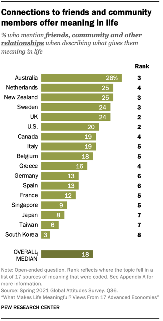 반면에 동아시아 대중은 친구나 커뮤니티를 언급할 가능성이 가장 낮습니다. 10명 중 1명만이 이 장소에서 이러한 관계를 제기합니다. 대만, 한국, 일본에서는 공동체를 의미의 최고 원천으로 언급하지 않습니다.
