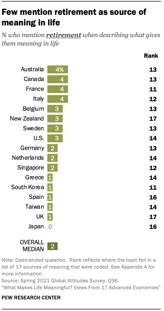 상대적으로 소수(4%)가 중위 대중에서 배우자나 파트너를 언급하지만, 미국과 대만은 예외적으로 두드러집니다. 거의 미국 성인 10명 중 1명(9%)이 배우자나 파트너를 언급하며, 이는 9번째로 가장 많이 언급되는 의미 출처입니다. 대조적으로, 그것은 대중의 1% 미만이 배우자 또는 파트너를 언급하는 대만에서 가장 적게 언급되는 주제 중 하나입니다.