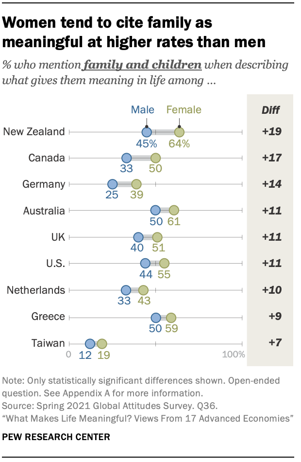 또한 여성은 남성보다 가족이나 자녀를 언급할 가능성이 더 높습니다. 예를 들어, 뉴질랜드에서는 여성의 약 3분의 2(64%)가 가족을 언급하는 반면 남성은 절반 미만(45%)이 가족을 언급합니다. 특히, 이러한 성별 격차는 스페인과 이탈리아 또는 전반적으로 가족에 대한 언급이 적은 아시아 대중(한국, 싱가포르, 일본)에서 두드러지지 않습니다.