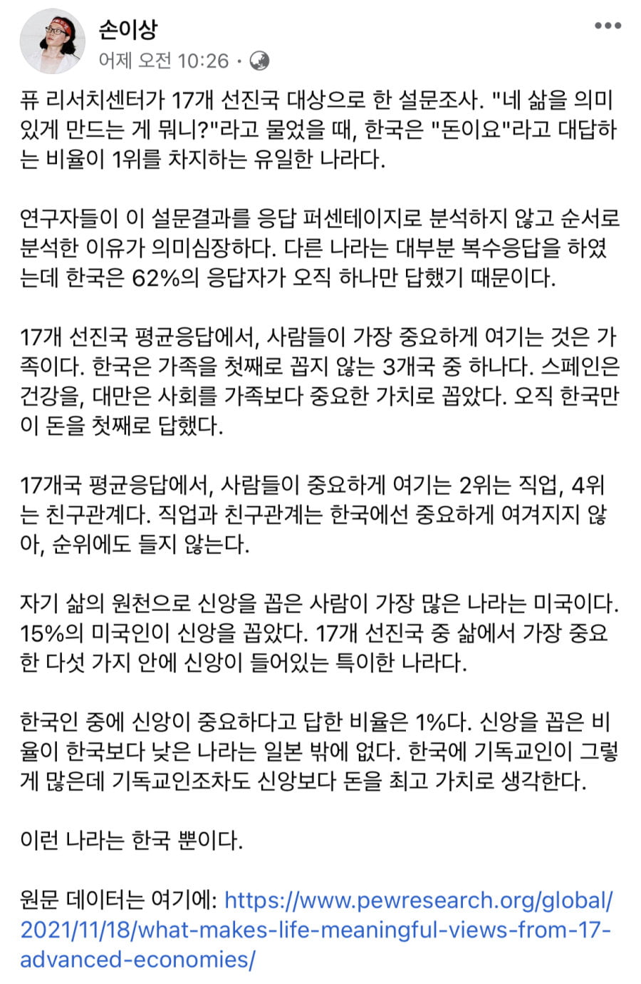 그리고 한국이 "돈이요"라고 대답하는 비율이 17개 선진국 중 1위를 차지하는 유일한 나라라고 했는데 이거 오해할 여지가 있다.