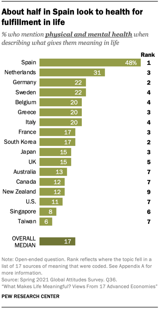 건강 역시 상대적으로 가장 중요하게 생각하는 항목으로 설문조사 대상의 약 3분의 1에 해당하는 사람들이 가장 중요하게 생각하는 3대 요소 중 하나로 꼽힙니다. 그러나 건강에 대한 상대적 강조는 스페인에서 건강을 언급하는 48%(스페인인에게 가장 중요한 의미의 원천이 됨)에서 대만에서 동일하게 말하는 단 6%까지 매우 다양할 수 있습니다. 일부 미국 여성은 특정 건강 문제로 인해 자신의 건강을 소중하게 여깁니다. 예를 들어, “하나님이 저에게 생명을 주셨고 암을 이겨내게 하셨습니다. 인생은 소중하고 우리에게 주어진 기회는 단 한 번뿐입니다.” 다른 사람들은 더 일반적으로 건강을 다른 의미의 원천에 대한 전제 조건으로 언급하며, 자신이 가치 있게 여기는 목록의 일부로 "건강함" 또는 "여전히 호흡하는 것"을 강조합니다. 운동과 건강한 생활 방식도 의미의 원천으로 선전됩니다.