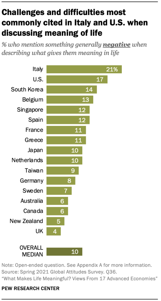 삶을 의미 있고 만족스럽게 만드는 것에 대해 논의할 때, 설문에 응한 17명의 대중 중 중앙값 10%는 행복 추구를 방해한 어려움이나 어려움도 언급했습니다. 다시 한 번, 이것은 조사 대상 대중에 따라 크게 달라집니다. 약 5분의 1이 이탈리아에서 어려움을 언급하지만 뉴질랜드와 영국에서는 5% 이하만이 동일하게 말합니다. 이탈리아, 미국, 스페인을 포함한 일부 조사 대상 지역에서는 사회, 장소 및 제도를 언급한 사람들이 어려움이나 어려움을 언급할 가능성이 더 큽니다. 한국과 대만에서는 그 반대가 사실입니다. 두 대중 모두에서 자신의 사회를 언급하는 사람들이 적습니다. 부정적인 것을 언급할 가능성이 높습니다. 가족이나 친구에게서 의미를 찾는 사람들도 어려움이나 어려움을 언급할 가능성이 적고, 교육과 배움, 취미를 언급하는 사람들도 마찬가지입니다.