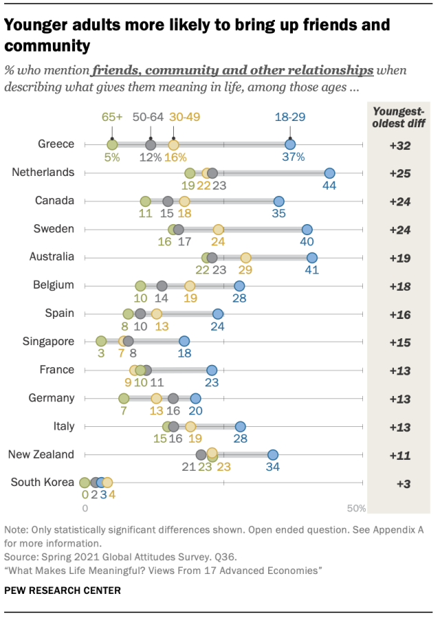 많은 설문 조사에서 18세에서 29세 사이의 젊은 성인은 나이든 사람들보다 친구와 지역 사회를 더 자주 불러옵니다. 그리스에서 연령 차이가 가장 큽니다. 젊은 성인의 37%가 친구나 가족 이외의 다른 관계에 대해 이야기하는 반면, 65세 이상은 5%에 불과합니다.