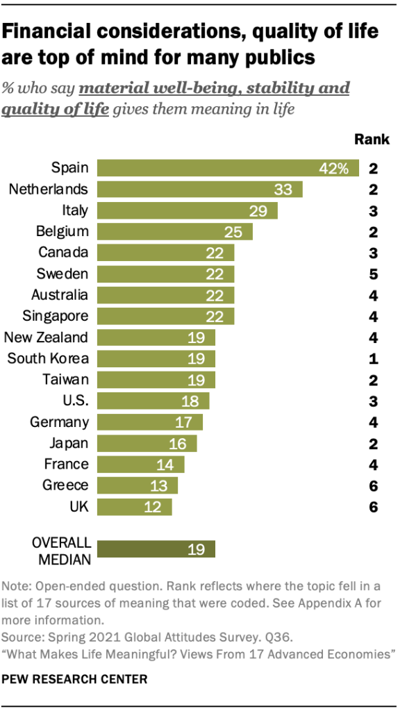 또한 많은 사람들은 의미 있는 삶을 살기 위해 기본적인 재정적 필요가 충족되는 것 또는 어느 정도의 사치품을 갖는 것의 중요성을 강조합니다. 설문에 응한 17명의 대중 중 9명에서 물질적 웰빙은 사람들이 가장 많이 언급한 세 가지 요소 중 하나이며 대부분의 경우 약 5분의 1 또는 그 이상이 언급합니다. 한국에서는 심지어로 나온다 상단 의미의 소스. 그럼에도 불구하고 응답자들이 언급한 라이프스타일 요소는 "식탁 위의 음식"과 "머리 위의 지붕"에서 "가족을 부양할 수 있는 적당한 수입", "부채가 없음"에서 오토바이 또는 오토바이 타기를 즐기기에 "충분한 돈"에 이르기까지 다양합니다. 여행과 같은 다른 활동.