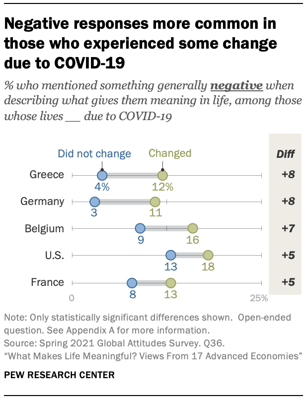 미국에서는 14%가 삶의 의미에 대해 이야기할 때 사회와 장소를 언급합니다. 일부의 경우 이러한 언급이 미국 대통령 또는 2020년 대통령 선거와 직접적으로 연결되었습니다. 한 미국 여성은 자신이 의미를 찾는 위치를 설명하면서 이렇게 말했습니다. 우리는 바이든을 대통령으로 하는 무서운 시기에 있습니다.” 반면 다른 여성은 “지난 대선 결과에 안도했다”며 조 바이든 대통령의 승리를 지지했다. 특히, 부정적인 반응을 언급한 미국인은 미국 사회나 그들이 사는 곳을 언급할 가능성이 거의 30점 더 높습니다. 그 중 거의 절반(41%)이 미국 사회에서 부정적인 것을 언급하는 반면 부정적인 것을 언급하지 않는 사람들은 12%에 불과합니다.