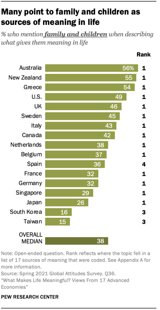 사람들의 답변을 분석하면 의미의 한 원천이 가족이라는 것이 분명합니다. 조사에 응한 17개 선진국 중 14개 국가에서 다른 어떤 요소보다 가족을 삶의 의미의 원천으로 더 많이 언급했습니다. 부모, 형제자매, 자녀 및 손자녀와의 관계를 강조하면서 사람들은 친척과 함께 보낸 양질의 시간, 친척의 성취로부터 얻는 자부심, 심지어는 자손에게 더 나은 세상을 남기는 삶을 살고자 하는 열망을 자주 언급합니다. 호주, 뉴질랜드, 그리스, 미국에서는 약 절반 이상이 가족이 삶을 만족스럽게 만드는 존재라고 말합니다.