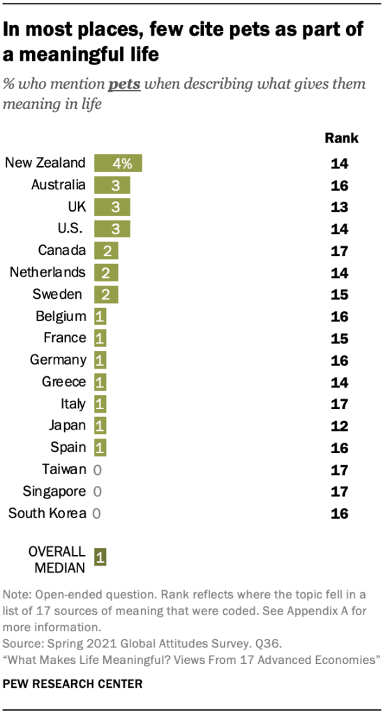 설문 조사에 참여한 대중들 중 어느 누구에게도 일반적으로 언급되지는 않았지만 애완동물은 뉴질랜드 성인의 4%, 미국인, 호주인 및 영국인의 3%에게 의미의 원천입니다. 이러한 특정 국가를 제외하고는 대부분의 지역에서 극소수(한국과 대만 모두)에서 동물을 의미의 원천으로 언급하지 않습니다.