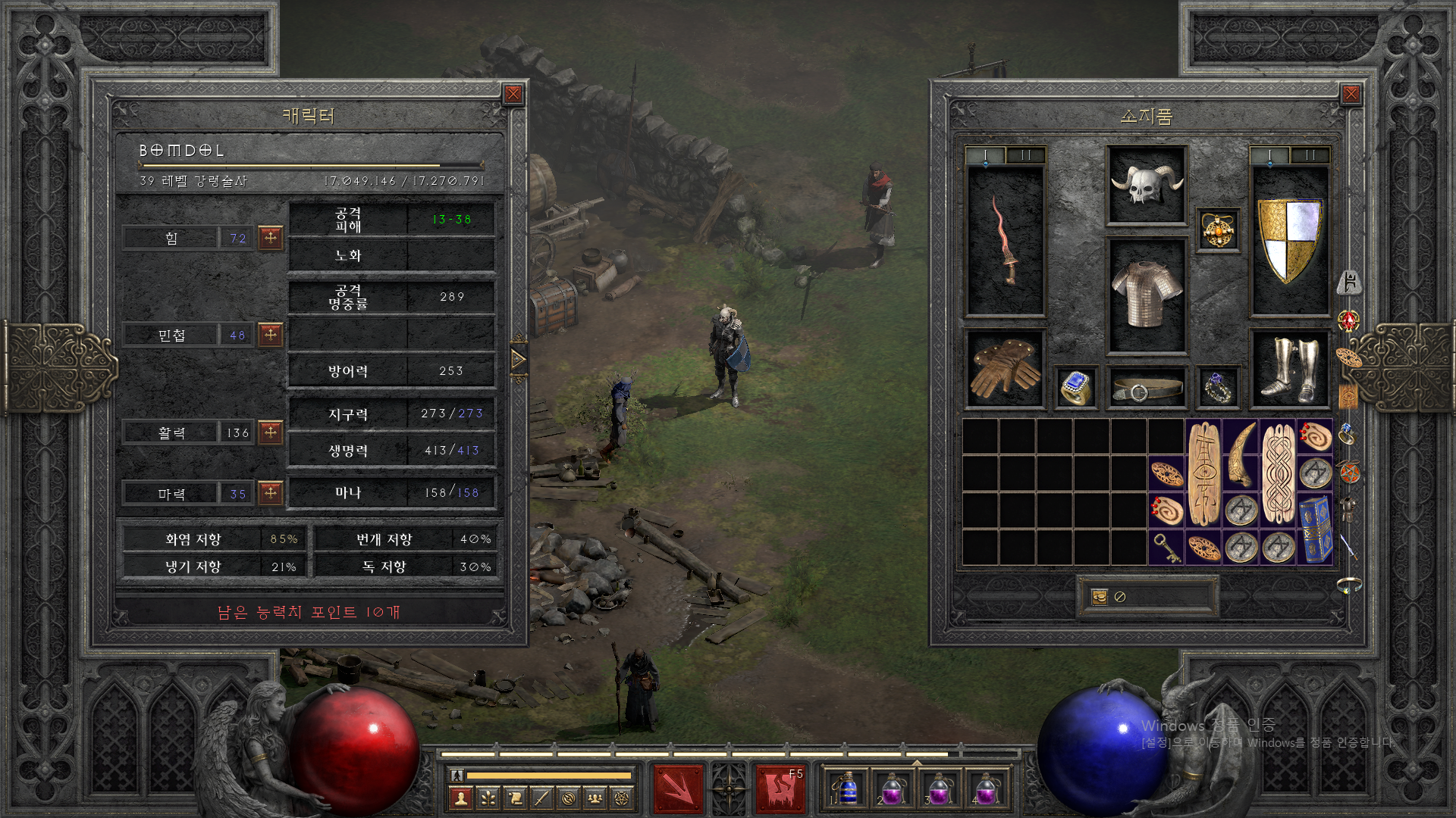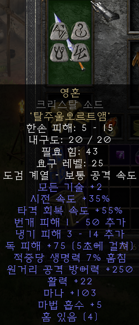 이제 샤엘 룬도 주웠으니 각운(제왕운시)도 만들어 주고, 4소켓 검/방패 주워서 영혼(스피릿)도 만들어야지.