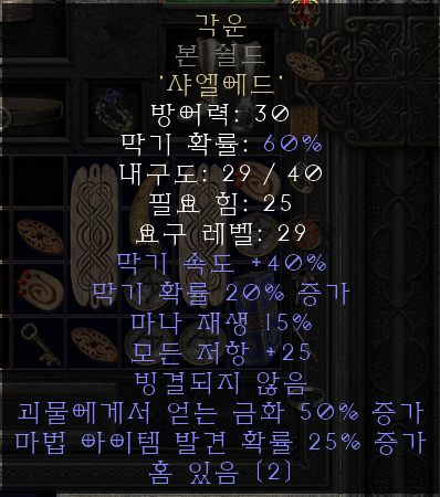 각운(방패 2소켓 샤엘+에드) - 마나 수급이나 모저가 유용하다. 룬이 충분하다면 방어력 높은 걸로 바꾸는 게 좋다.