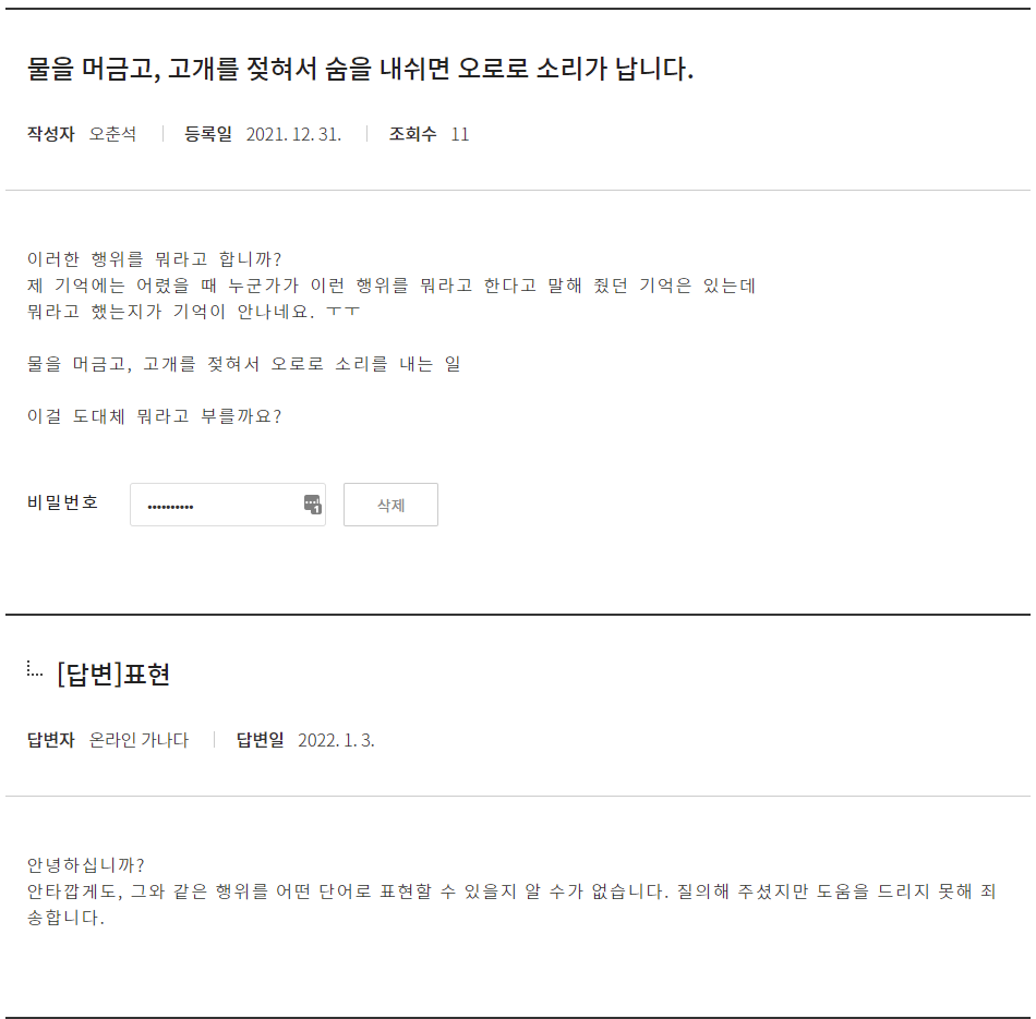 물을 머금고, 고개를 젖혀서 오로로 소리를 내는 일