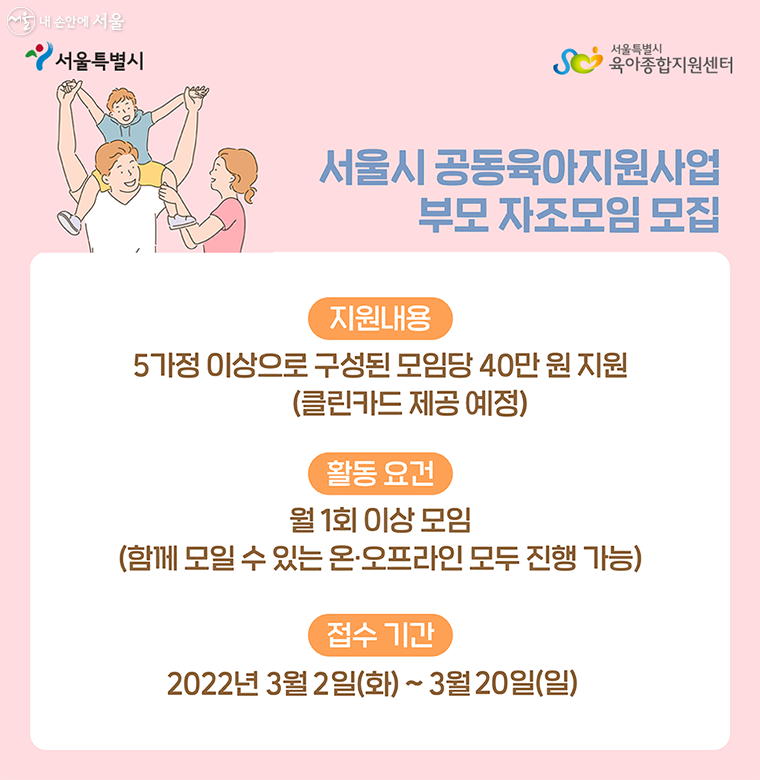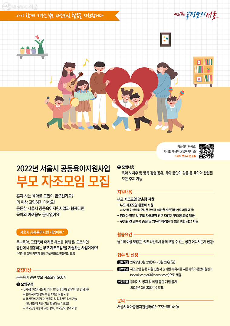신청은 3월 2일부터 20일까지 이며, 서울시에 거주하는 돌봄아동(만6세 이하)이 있는 가정 5가구 이상으로 구성된 온·오프라인 활동 중인 부모 자조모임이라면 누구나 신청할 수 있다.