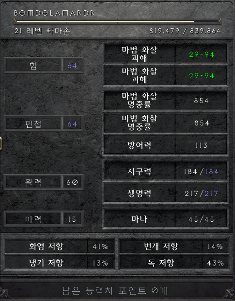 렙이 되면 하나씩 찍어 주고, 남는 건 [마법 화살]에 찍어줍니다. (10렙까지)