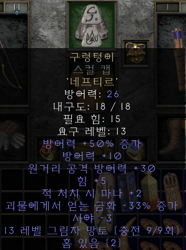 나중에 고렙 활을 들려고 하면 힘이 85가 있어야 되거나, 민첩이 138이 있어야 하거나 등등,