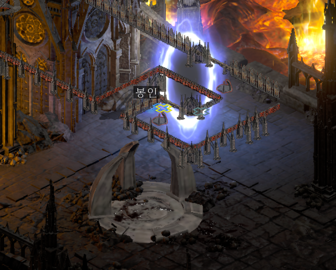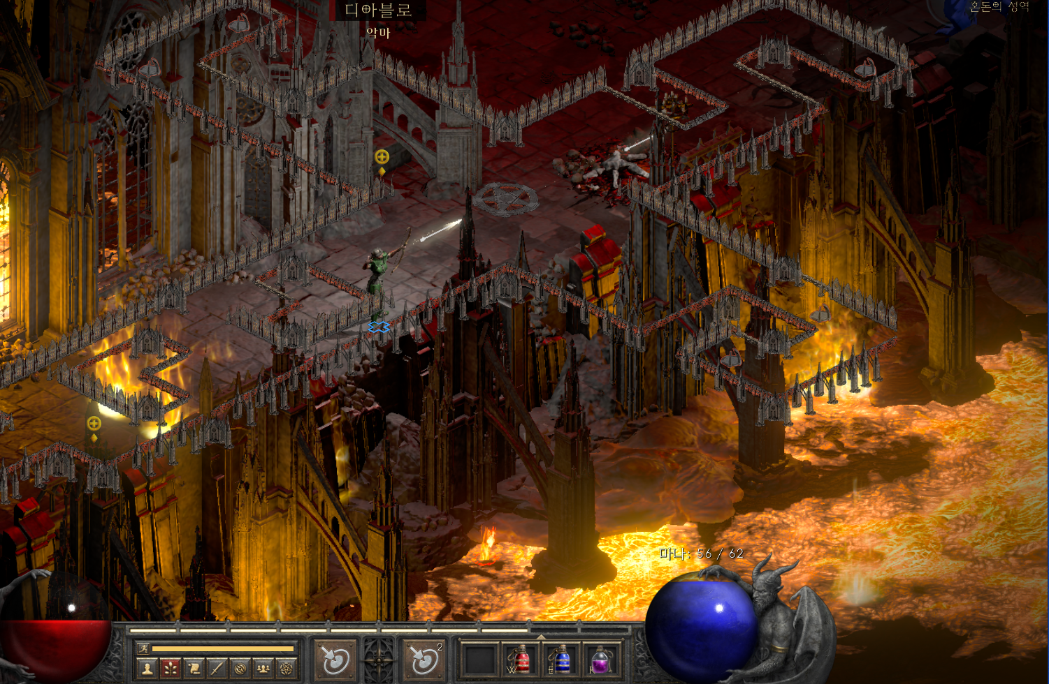 가끔 위의 그림에서 보이는 기둥(반투명 맵의 오망성 옆에 보이는 기둥)을 사이에 두고 디아블로의 공격은 나에게 안 닿는데, 내 공격은 기둥 사이를 뚫고 날아가는 경우도 있습니다.