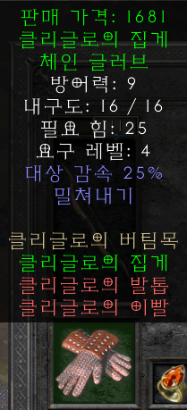 [클리글로의 집게]는 [감속 25%]와 [밀쳐내기] 밖에 없고 방어력도 약한 렙제 4렙의 저렙 장비이지만