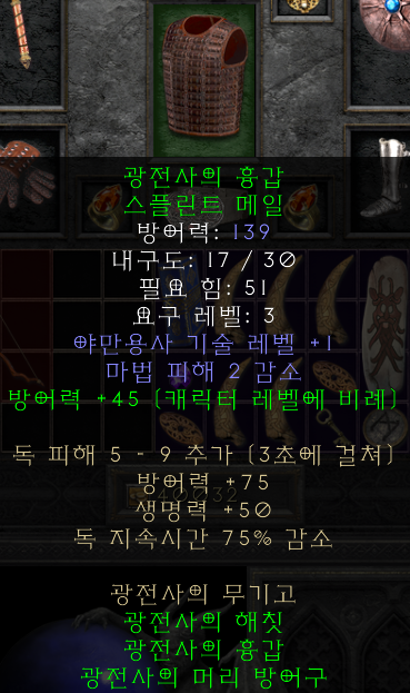 [광전사의 무기고]를 착용하면 방어력 증가, 생명력 증가, 독 시간 감소 등의 좋은 효과가 있고, 장비 3개를 다 차면 총 240 이상의 방어력을 가지게 되어서 노말에서는 무리없이 사냥이 가능하다.