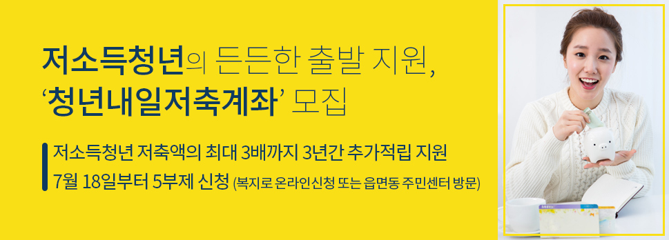 □ 보건복지부는 경제적으로 어려운 청년이 목돈을 마련하여 든든하게 사회생활을 출발할 수 있도록 지원하기 위해 “청년내일저축계좌”를 도입하고, 7월 18일(월)부터 8월 5일(금)까지 신청을 받는다고 밝혔다.
