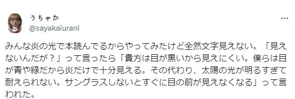 우리는 눈이 파란색이나 녹색이라 장작 불빛만 있어도 보여.